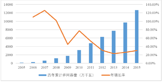 全國2005 年至2015 年風(fēng)電歷年累計(jì)并網(wǎng)容量及年增長率