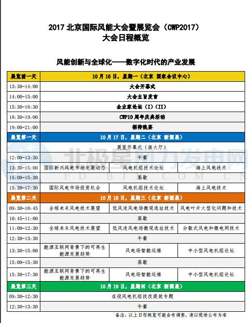 一年一度的風(fēng)電行業(yè)最大盛會(huì)——2017北京國際風(fēng)能大會(huì)暨展覽會(huì)(CWP2017)即將來臨。本次盛會(huì)將于10月17-19日在新國展舉行。以下為具體大會(huì)日程: