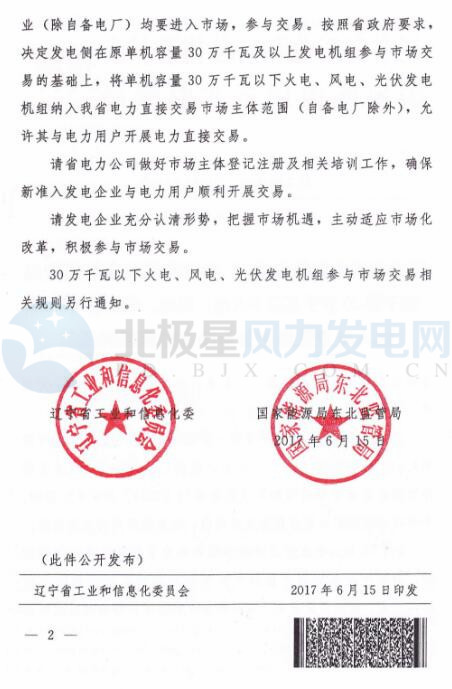 遼寧工信委:30萬千瓦以下風(fēng)電機(jī)組參與電力直接交易(附文)