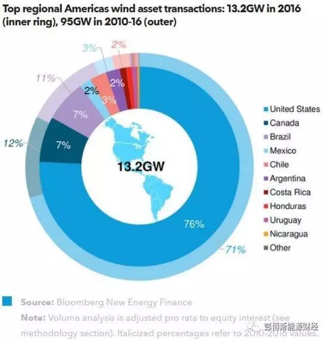 在2016年底,美洲共有148GW的陸上風(fēng)電裝機容量。根據(jù)公開渠道顯示,從2010年來,至少有33%/49.6GW的容量有經(jīng)歷轉(zhuǎn)手。當(dāng)然其中也有經(jīng)歷轉(zhuǎn)手但暫無公開信息的項目數(shù)據(jù)。