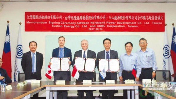 昨天簽約儀式有臺船董事長鄭文隆、總經(jīng)理曾國正、副總經(jīng)理林福堂、行政院能源及減碳辦公室執(zhí)行長楊鏡堂與玉山能源執(zhí)行長陳聰華等人參與,民進黨立委林岱樺也出席簽約儀式。