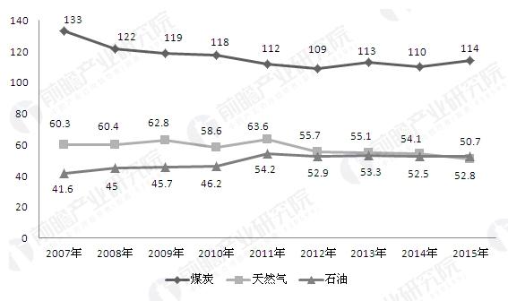 2007-2015年全球傳統(tǒng)能源的儲采比情況(單位:年)