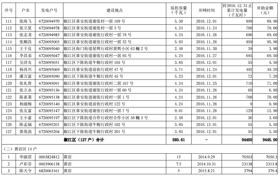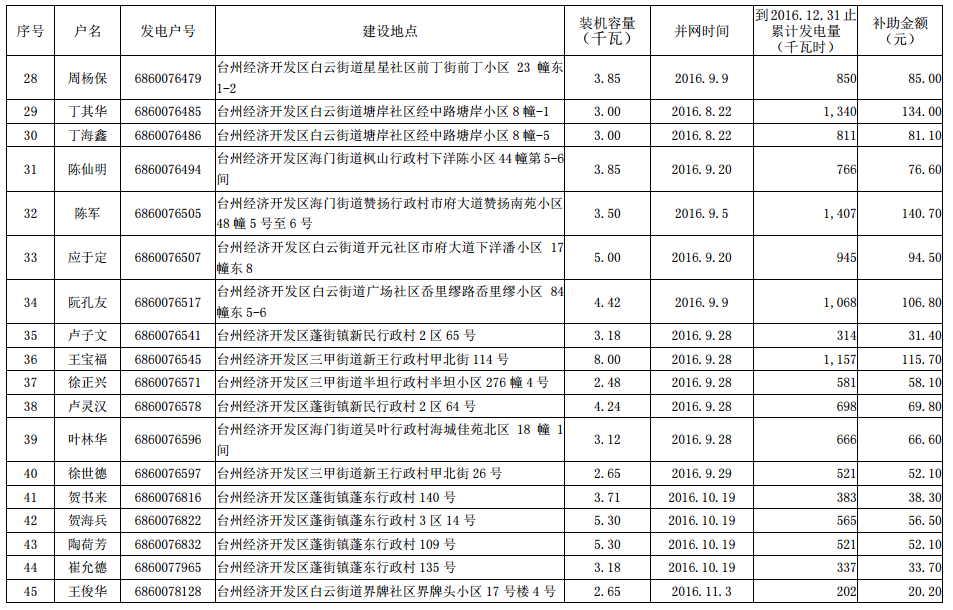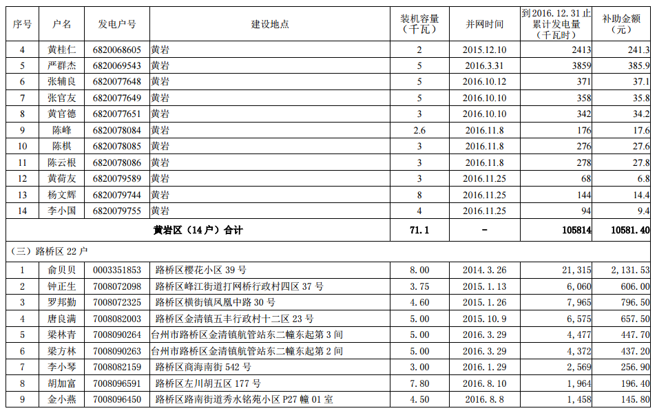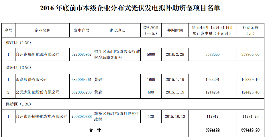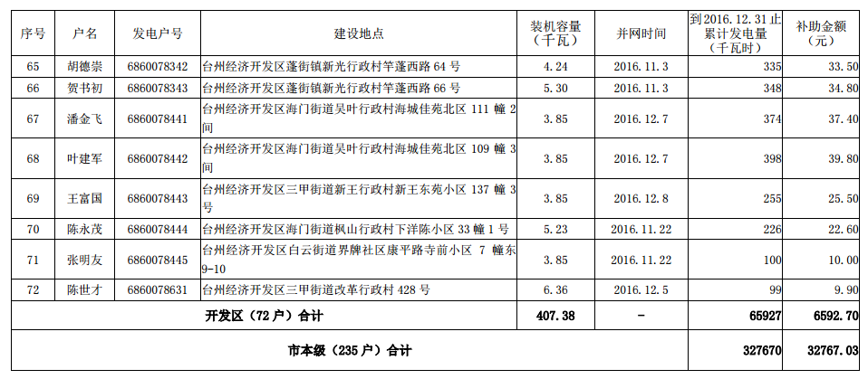 4家企業(yè) 235戶居民 2016年底前臺(tái)州市本級(jí)分布式光伏擬補(bǔ)助資金項(xiàng)目名單公示