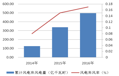 2014-2016年我國棄風(fēng)電量及棄風(fēng)率