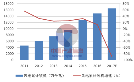 根據(jù)“十三五”末非化石能源比重提高至15%的目標(biāo),未來五年需年均新增風(fēng)力發(fā)電量約600億千瓦時。預(yù)計2017年全國風(fēng)力發(fā)電量將達到3060億千瓦時,同比增長近27%。