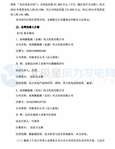 11 月16 日,哈爾濱九洲電氣股份有限公司與亞洲新能源(金湖)風(fēng)力發(fā)電有限公司簽署了關(guān)于《亞洲新能源金湖縣 100MW 風(fēng)電場(chǎng) BT 總承包合同》,合同總價(jià)款 85,000 萬元;與亞洲新能源(寶應(yīng))風(fēng)力發(fā)電有限公司簽署了關(guān)于《亞洲新能源寶應(yīng)縣 100MW 風(fēng)電場(chǎng) BT 總承包合同》,合同總價(jià)款 87,000 萬元,約占 2016 年度營(yíng)業(yè)收入的 65.93%;共計(jì)合同總價(jià)款 172,000 萬元,約占 2016 年度營(yíng)業(yè)收入的 130.35%。
