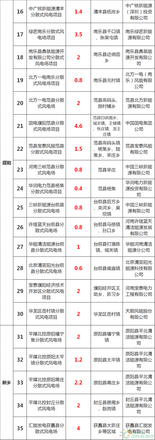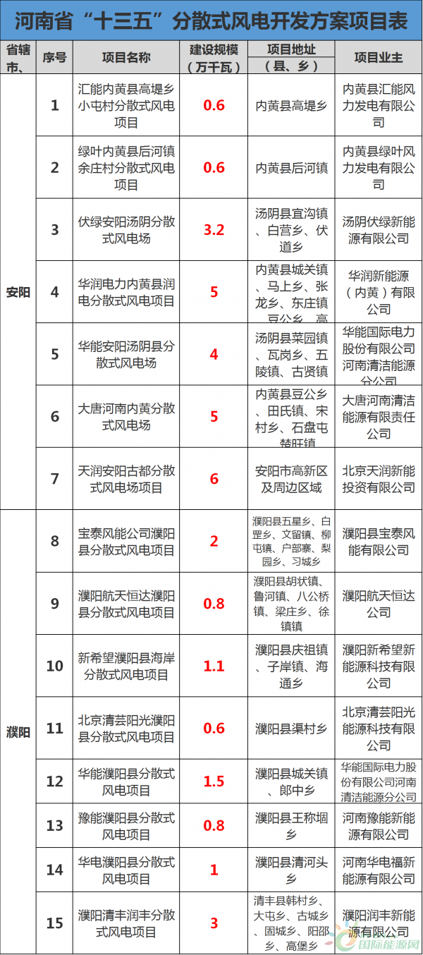 今天(12月6日),河南省發(fā)改委不發(fā)了《關(guān)于下達河南省“十三五”分散式風(fēng)電開發(fā)方案的通知》以及河南省“十三五”分散式風(fēng)電開發(fā)方案項目表。124個風(fēng)電項目,共計規(guī)模210.7萬千瓦!濮陽、洛陽、平頂山、永城是規(guī)劃項目最多的地區(qū)。