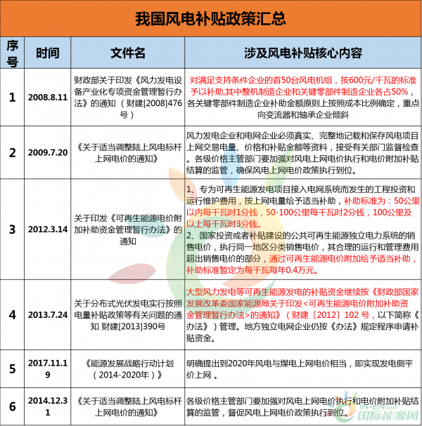 國家政策對風(fēng)電的支持是促進風(fēng)電取得如今成就的重要條件。風(fēng)哥梳理了近年來關(guān)于風(fēng)電補貼的一些政策,如下表所示: