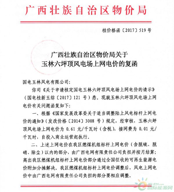 今天(12月27日),廣西發(fā)改委發(fā)布了《廣西壯族自治區(qū)物價局關(guān)于玉林六坪頂風(fēng)電場上網(wǎng)電價的復(fù)函》,文件稱:經(jīng)審核,玉林六坪頂風(fēng)電場上網(wǎng)電價為0 61元 千瓦時(含稅),接網(wǎng)費為0 01元 千瓦時,自投入商業(yè)運