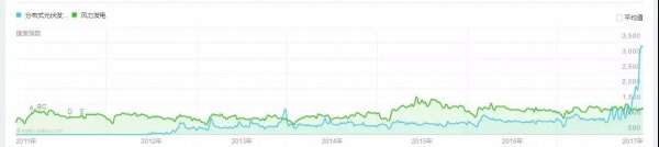事實上,與時下走俏的分布式光伏相比,分散式或分布式風電知者不多,屬于較為冷門的能源領域。在“分布式風力發(fā)電”未被收錄到百度指數(shù)庫的情況現(xiàn),對比“分布式光伏發(fā)電”和“風力發(fā)電”的百度指數(shù),可以看到“分布式光伏發(fā)電”的搜索熱度呈指數(shù)式上升,而“風力發(fā)電”的搜索熱度并未見到明顯的上升趨勢。