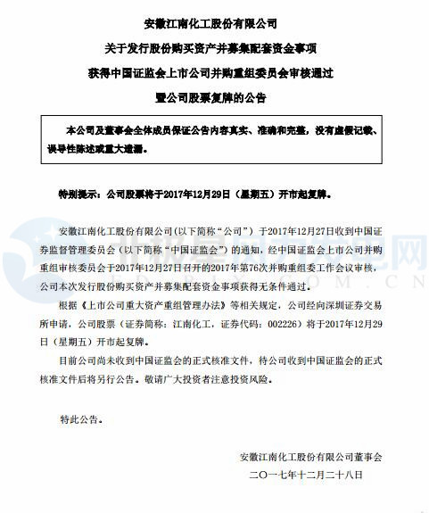12月27日,證監(jiān)會(huì)并購(gòu)重組委會(huì)議正式審議通過(guò)江南化工重大資產(chǎn)重組項(xiàng)目,盾安集團(tuán)旗下江南化工與盾安新能源兩大產(chǎn)業(yè)在2017歲末之際"在一起",盾安集團(tuán)旗下又新增一上市業(yè)務(wù)板塊。圖片來(lái)自江南化工官方公告江南化
