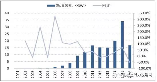 2001~2016 全國(guó)風(fēng)電新增裝機(jī)情況