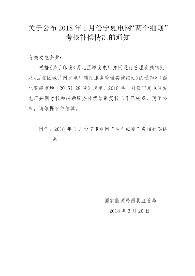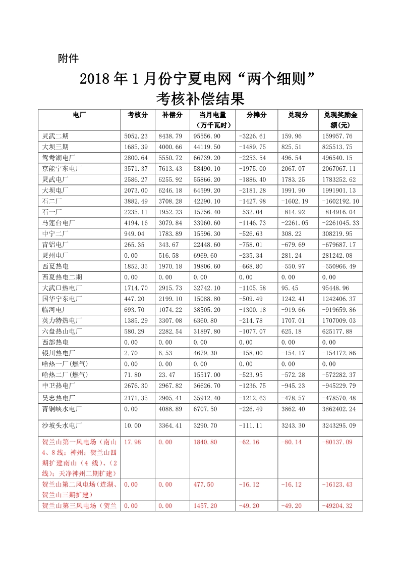 根據(jù)《關(guān)于印發(fā)<西北區(qū)域發(fā)電廠并網(wǎng)運(yùn)行管理實(shí)施細(xì)則>及<西北區(qū)域并網(wǎng)發(fā)電廠輔助服務(wù)管理實(shí)施細(xì)則>的通知》(西北監(jiān)能市場(chǎng)〔2015〕28號(hào))規(guī)定,2018年1月份寧夏電網(wǎng)發(fā)電廠并網(wǎng)考核和輔助服務(wù)補(bǔ)償結(jié)果復(fù)核工作已完成,現(xiàn)予公布,請(qǐng)依據(jù)附件結(jié)算。