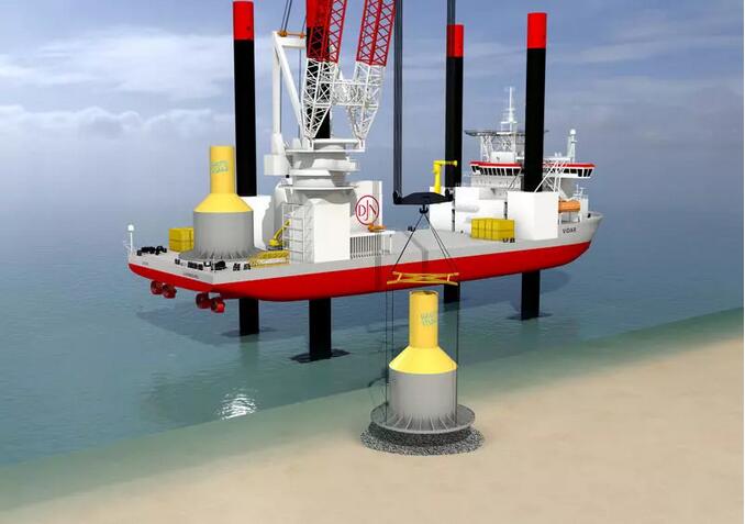 基礎(chǔ)安裝前需要平整海底,再安裝重達500噸的中空基礎(chǔ)。基礎(chǔ)安裝時采用Synchoist負載定位系統(tǒng),并使用美國恩派克千斤頂技術(shù),確保基礎(chǔ)保持絕對的垂直狀態(tài),也避免破壞水平的海床,有利于后續(xù)塔筒和風(fēng)機的安裝。