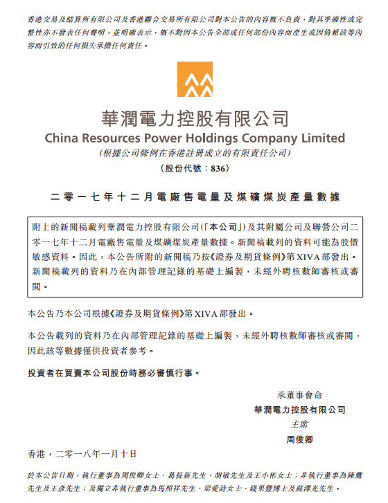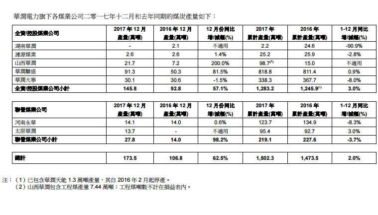 華潤(rùn)電力2017年12月附屬火電廠售電量同比增長(zhǎng)3.9%