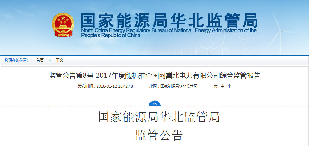 近日,國家能源局華北監(jiān)管局公布了第8號(hào)監(jiān)管公告(2018年第1號(hào)):2017年度隨機(jī)抽查國網(wǎng)冀北電力有限公司綜合監(jiān)管報(bào)告,全文如下: