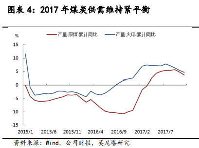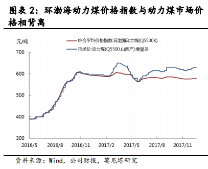 由于2017年中國經(jīng)濟(jì)增長良好,電力及相應(yīng)煤炭消費(fèi)持續(xù)回暖。而在去產(chǎn)能以及先進(jìn)產(chǎn)能釋放不及預(yù)期的情況下,原煤產(chǎn)量的同比增速持續(xù)低于火電發(fā)電量的同比增速(圖表4)。因此,2017年全年煤炭供需持續(xù)處于緊平衡的狀態(tài),這也導(dǎo)致動力煤價(jià)格長期高于發(fā)改委劃定的綠色價(jià)格區(qū)間。按照發(fā)改委等四部委印發(fā)的《關(guān)于平抑煤炭市場價(jià)格異常波動的備忘錄的通知》中關(guān)于煤炭價(jià)異常波動預(yù)警機(jī)制,當(dāng)動力煤價(jià)格在重點(diǎn)煤炭企業(yè)動力煤中長期基準(zhǔn)合同價(jià)格6%上下波動時(shí),動力煤價(jià)格處于綠色區(qū)間,即處于正常價(jià)格區(qū)間。2017年重點(diǎn)煤炭企業(yè)Q5500動力煤中長期基準(zhǔn)合同價(jià)格為535元/噸,動力煤價(jià)格的綠色區(qū)間應(yīng)當(dāng)在500至570元/噸之間。截至2018年1月3日,環(huán)渤海Q5500動力煤價(jià)格指數(shù)為578元/噸,秦皇島港山西產(chǎn)Q5500動力煤價(jià)格為630元/噸,均高于發(fā)改委劃定的綠色價(jià)格區(qū)間。