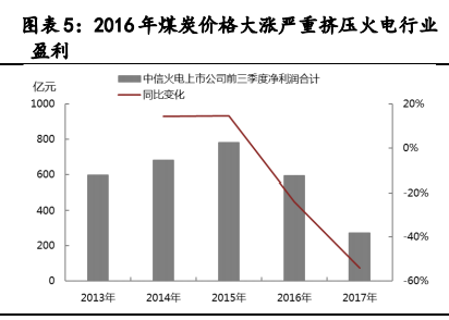 煤價(jià)長期處于高位直接導(dǎo)致火電企業(yè)盈利水平被大幅壓縮。2017年前三季度中信行業(yè)分類的36家火電上市公司的合計(jì)凈利潤同比銳減54.2%,處于近五年來的低位(圖表5)。