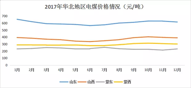 2017年華北地區(qū)電煤價格總體走勢比較平穩(wěn),并無較大波動,但地區(qū)之間差距較大。山東電煤價格最高,全年呈V字型走勢,1月價格最高,其次是10月、6月最低。山西電煤價格全年走勢和山東幾乎一致,10月價格最高,其次是1月、6月最低。蒙西全年變化幅度較小,穩(wěn)定在300元/噸左右,10月價格最高,6月最低。蒙東是全國電煤價格最低的地區(qū),但全年價格走勢卻和華北其它地區(qū)相反,7月價格最高,11月最低。