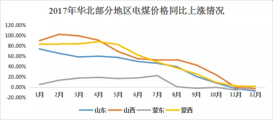 從同比情況來看,山東、山西、蒙西全年均呈大幅下降趨勢,蒙東同比變化幅度較小,1-7月上升至22.25%,隨后下降,但蒙東地區(qū)價格基數(shù)低,因此變化幅度不大。結(jié)合華北地區(qū)2017全年價格走勢,2016年華北地區(qū)電煤價格上漲幅度較大,2016年底達到高位,2017全年基本維持在高位,變化幅度不大。