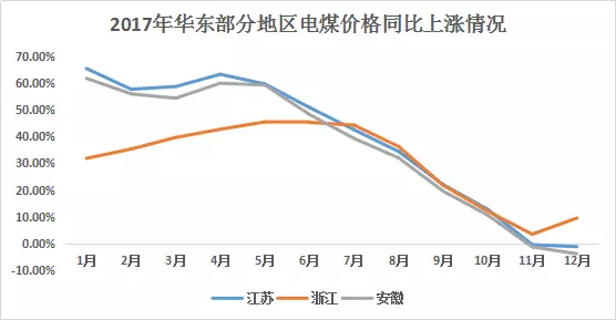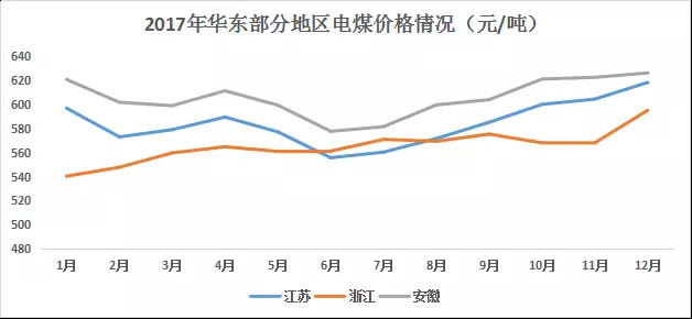2017年華東地區(qū)安徽、江蘇全年電煤價格走勢呈W狀波動走勢,2月的江蘇和3月安徽分別出現(xiàn)較低點,4月兩地區(qū)均出現(xiàn)上漲,6月兩地區(qū)分別降低至全年最低點,最后一路上漲,12月達到最高位。浙江總體呈上升趨勢,12月達到最高位,過程略有波動。