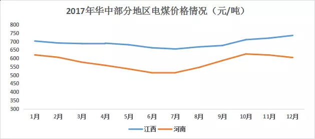 2017年華中地區(qū)電煤價格較高的地區(qū)有兩個,分別是江西和河南。12月份江西電煤價格排全國第二,全年價格均處于高位,呈V字型小幅度波動,12月價格最高,其次是1月;7月最低。河南作為總裝機6000萬千瓦以上的省份電煤價格一直處于較高位置,全年呈V字型,10月價格最高,隨后年底價格略有回落,6月最低。