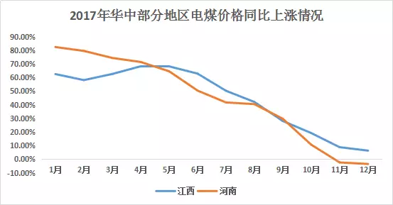 從同比情況看,2017年江西和河南總體同比大幅度下降。江西在上半年有小幅度回升,自5月份起開始大幅度下降,年底將至最低值。河南全年均為大幅下降趨勢,從年初的82.26%高位下滑至年終的-3.53%。結(jié)合2017全年價格走勢,2016年江西、河南電煤價格漲幅較大,2017年基本穩(wěn)定在高位,江西與2016年最高水平基本持平,河南與2016年最高水平相比略有回落。