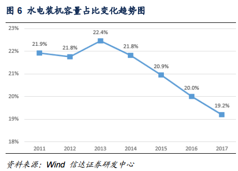 從發(fā)電量角度而言,2017年水電發(fā)電量約為12211億千萬時,水電發(fā)電量增速由2016年的3.8%降至2.2%,水電發(fā)電量在全國全社會用電量中的占比也由2016年的20.2%降至2017年的19.4,這主要是因為最近兩年氣候原因?qū)е碌乃坎粔虺渥?,未來我們預(yù)計水電發(fā)電量在全社會用電量中的占比將維持在20%左右;近年來,風電裝機容量在發(fā)電設(shè)備裝機總量中的占比不斷提高,2017年,風電發(fā)電量約為3057億千瓦時,約占全社會用電量的4.8%,并網(wǎng)風電裝機容量占比達到9.2%,整體上呈現(xiàn)逐漸上升的趨勢。