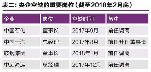 黨的十八大后,因反腐、央企重組等因素,央企領(lǐng)導(dǎo)崗位空缺現(xiàn)象一度十分突出。2016年初,央企有14個(gè)重要崗位出現(xiàn)空缺?!秶?guó)資報(bào)告》這一次的統(tǒng)計(jì)發(fā)現(xiàn),崗位空缺現(xiàn)象已經(jīng)極大緩解。截至2018年2月底,央企主要負(fù)責(zé)人崗位只有4個(gè)空缺(見(jiàn)表二)。