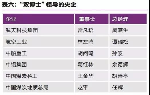 其中,至少有6家央企的董事長(zhǎng)、總經(jīng)理均是博士(見(jiàn)表六)。