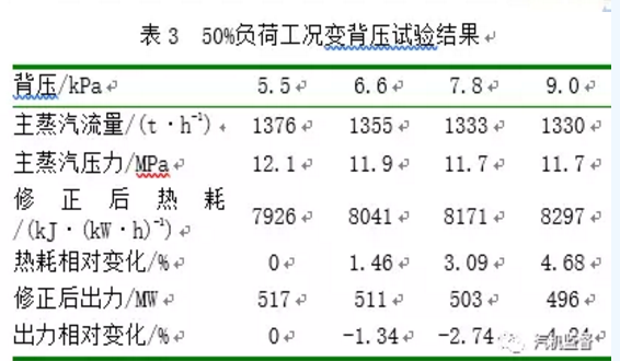 50%負(fù)荷工況下,背壓由5.5kPa上升3.5kPa時(shí),汽輪機(jī)熱耗上升4.7%左右,出力下降4.2%左右。該工況下,背壓平均每變化1kPa分別影響熱耗和出力約1.34%和1.21%。