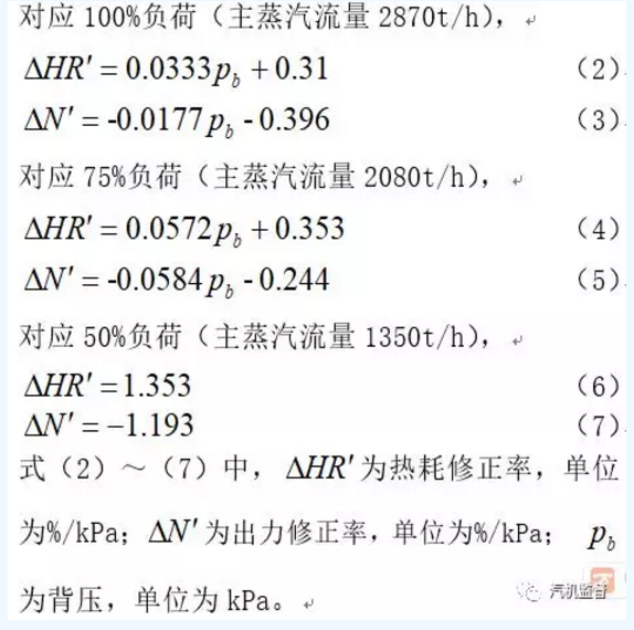 根據(jù)圖2、圖3曲線,易得到各負(fù)荷工況背壓變化對(duì)熱耗和出力相對(duì)影響量的關(guān)系式。對(duì)這些關(guān)系式求取一階導(dǎo)數(shù),得出對(duì)應(yīng)于不同背壓下熱耗和出力的修正率,可作為該型汽輪機(jī)背壓對(duì)熱耗和出力的修正依據(jù)。