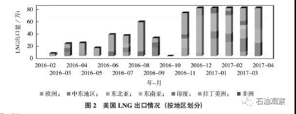 目前,SabinePass(薩賓帕斯)項(xiàng)目已經(jīng)向20余個(gè)國家成功出口了至少100船LNG資源,覆蓋全球60%以上的LNG需求國家和地區(qū),包括埃及、約旦、巴基斯坦等新興買家。 SabinePass(薩賓帕斯)項(xiàng)目的前5條生產(chǎn)線大部分已通過簽訂長期FOB采購合同售出,買家包括BG(2016年被殼牌收購)、GNF、Kogas、GAIL、Total、Centrica等公司。預(yù)計(jì)2017年SabinePass(薩賓帕斯)正在運(yùn)營及計(jì)劃投產(chǎn)的生產(chǎn)線將達(dá)到滿負(fù)荷生產(chǎn)能力(1800萬t/a)。美國LNG出口情況詳見圖2。