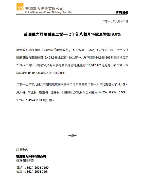 2017年首8個(gè)月附屬燃煤電廠同廠同口徑售電量同比增長4.1%。湖北省、河北省、廣東省、江蘇省、河南省及其他省份分別增長14.8%、8.9%、3.6%、1.5%、1.4%及3.8%。