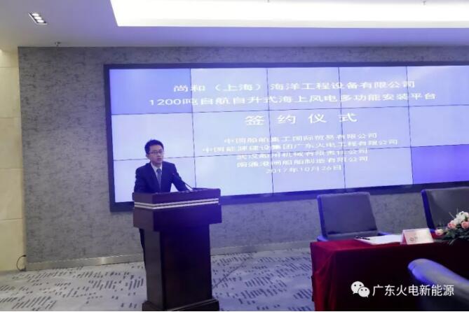2017年10月26日,尚和(上海)海洋工程設備有限公司1200噸自航自升式海上風電多功能安裝平臺建造項目總包合同、船體分包合同暨與中國能源建設集團廣東火電工程有限公司(簡稱:中國能建廣東火電)戰(zhàn)略合作協(xié)議在