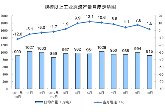 10月份,原煤產(chǎn)量2.8億噸,同比增長1.5%,增速比9月份回落6.1個(gè)百分點(diǎn);日均生產(chǎn)914.7萬噸,比9月份減少79.1萬噸。1-10月份,原煤產(chǎn)量28.5億噸,同比增長4.8%。