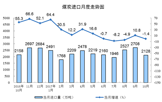 10月份,進(jìn)口煤炭2128萬噸,同比下降1.4%,增速由正轉(zhuǎn)負(fù),進(jìn)口量比9月份減少580萬噸。1-10月份,進(jìn)口煤炭2.3億噸,同比增長12.1%。
