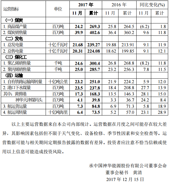 今日,中國神華能源股份有限公司公布了2017 年11 月份主要運(yùn)營數(shù)據(jù):11月份總發(fā)電量216 8億千瓦時,同比增長6 1%;1-11月累計(jì)總發(fā)電量2392 7億千瓦時,同比增長11 9%。11月份總售電量203 1億千瓦時,同比增長9