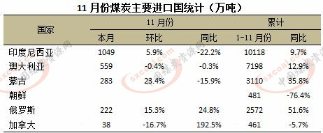 分國別看11月份中國進(jìn)口煤炭排在前五位的進(jìn)口國為印度尼西亞、澳大利亞、蒙古、俄羅斯及加拿大。上述五國共出口中國煤炭合計2150萬噸,占中國全部進(jìn)口煤炭的97.5%。