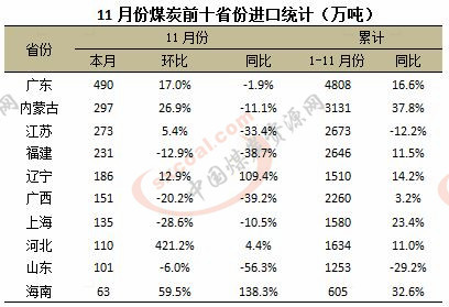 分省份看:11月份進(jìn)口量排在前五位的省份為廣東、內(nèi)蒙、江蘇、福建及遼寧。上述五省共進(jìn)口煤炭合計1477萬噸,環(huán)比增10.1%,同比降13.6%,上述五省進(jìn)口煤炭總量占中國全部進(jìn)口煤炭的67%。