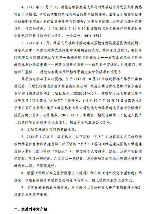 長青集團(tuán)8日晚間公告,公司子公司雄縣熱電與獲雄縣人民政府授權(quán)的雄縣住房和城鄉(xiāng)建設(shè)局于2018年1月8日簽訂《雄縣建成區(qū)集中供暖建設(shè)協(xié)議書》,雄縣住房和城鄉(xiāng)建設(shè)局授予雄縣熱電投資、建設(shè)、運(yùn)營本項(xiàng)目的經(jīng)營權(quán),項(xiàng)目分期建設(shè),雄縣熱電啟動(dòng)一期建設(shè),并根據(jù)項(xiàng)目所在地供暖需求情況適時(shí)啟動(dòng)二期、三期等建設(shè)。雄縣熱電在雄縣建成區(qū)新敷設(shè)供暖管網(wǎng),由集中供熱項(xiàng)目供應(yīng)熱源,向雄縣建成區(qū)供暖。雄縣熱電負(fù)責(zé)建設(shè)換熱首站1座、主管網(wǎng)長度約9公里、主管網(wǎng)至二級(jí)換熱站的支管網(wǎng)長度約6公里、二級(jí)換熱站12座。雄縣熱電將來根據(jù)經(jīng)營區(qū)域和范圍內(nèi)的實(shí)際合理用熱需求對(duì)供暖管網(wǎng)再作延伸建設(shè)。項(xiàng)目的實(shí)施在雄安新區(qū),能最大限度減少污染物排放和能源消耗,有利于推動(dòng)雄安新區(qū)的空氣環(huán)境質(zhì)量持續(xù)改善。