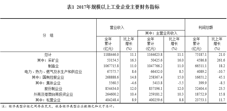 2017年,規(guī)模以上工業(yè)企業(yè)中,國有控股企業(yè)實現(xiàn)利潤總額16651.2億元,比上年增長45.1%;集體企業(yè)實現(xiàn)利潤總額399.9億元,下降8.5%;股份制企業(yè)實現(xiàn)利潤總額52404.4億元,增長23.5%;外商及港澳臺商投資企業(yè)實現(xiàn)利潤總額18752.9億元,增長15.8%;私營企業(yè)實現(xiàn)利潤總額23753.1億元,增長11.7%。