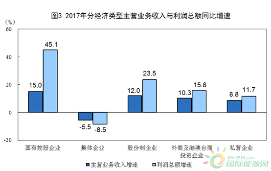 2017年,規(guī)模以上工業(yè)企業(yè)中,國(guó)有控股企業(yè)實(shí)現(xiàn)利潤(rùn)總額16651.2億元,比上年增長(zhǎng)45.1%;集體企業(yè)實(shí)現(xiàn)利潤(rùn)總額399.9億元,下降8.5%;股份制企業(yè)實(shí)現(xiàn)利潤(rùn)總額52404.4億元,增長(zhǎng)23.5%;外商及港澳臺(tái)商投資企業(yè)實(shí)現(xiàn)利潤(rùn)總額18752.9億元,增長(zhǎng)15.8%;私營(yíng)企業(yè)實(shí)現(xiàn)利潤(rùn)總額23753.1億元,增長(zhǎng)11.7%。