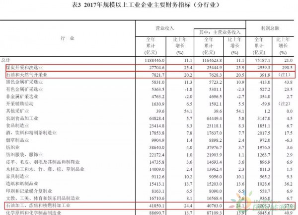 2017年,在41個(gè)工業(yè)大類行業(yè)中,37個(gè)行業(yè)利潤(rùn)總額比上年增加,1個(gè)行業(yè)持平,3個(gè)行業(yè)減少。主要行業(yè)利潤(rùn)情況如下:煤炭開采和洗選業(yè)利潤(rùn)總額比上年增長(zhǎng)2.9倍,農(nóng)副食品加工業(yè)增長(zhǎng)4.5%,紡織業(yè)增長(zhǎng)3.6%,石油加工、煉焦和核燃料加工業(yè)增長(zhǎng)27%,化學(xué)原料和化學(xué)制品制造業(yè)增長(zhǎng)40.9%,非金屬礦物制品業(yè)增長(zhǎng)20.5%,黑色金屬冶煉和壓延加工業(yè)增長(zhǎng)1.8倍,有色金屬冶煉和壓延加工業(yè)增長(zhǎng)28.6%,通用設(shè)備制造業(yè)增長(zhǎng)13.5%,專用設(shè)備制造業(yè)增長(zhǎng)29.3%,汽車制造業(yè)增長(zhǎng)5.8%,電氣機(jī)械和器材制造業(yè)增長(zhǎng)5.2%,計(jì)算機(jī)、通信和其他電子設(shè)備制造業(yè)增長(zhǎng)22.9%,石油和天然氣開采業(yè)由同期虧損轉(zhuǎn)為盈利,電力、熱力生產(chǎn)和供應(yīng)業(yè)利潤(rùn)總額比上年下降15.4%。