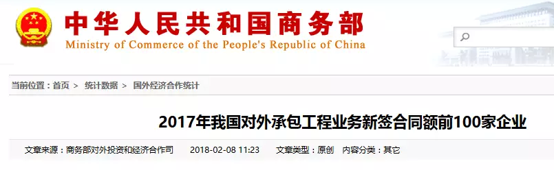 日前,從國家商務部獲悉,2017年我國對外承包工程業(yè)務新簽合同額前100家企業(yè)排名名單、我國對外承包工程完成營業(yè)額前100家企業(yè)排名名單出爐