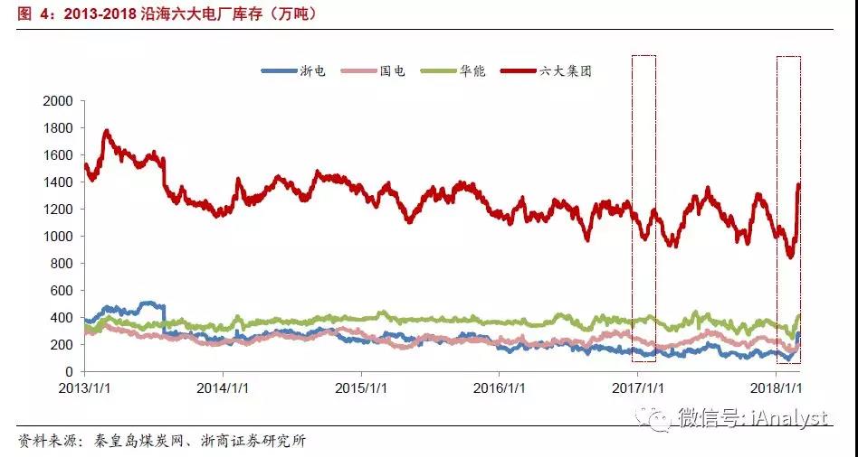 回顧2018年春節(jié)期間,需求增加明顯,但供給保障強(qiáng)于去年同期,產(chǎn)能釋放情況得到驗證。2018年春節(jié)前后30天,六大電廠合計耗煤量為1725萬噸,而去年同時期內(nèi),六大電廠耗煤量僅為1565萬噸,如圖3。在耗煤量大幅提升的情況下,2018年春節(jié)前后30天,六大電廠庫存提升488.23萬噸,而去年同時期內(nèi)庫存提升幅度僅為188.5萬噸,如圖4。