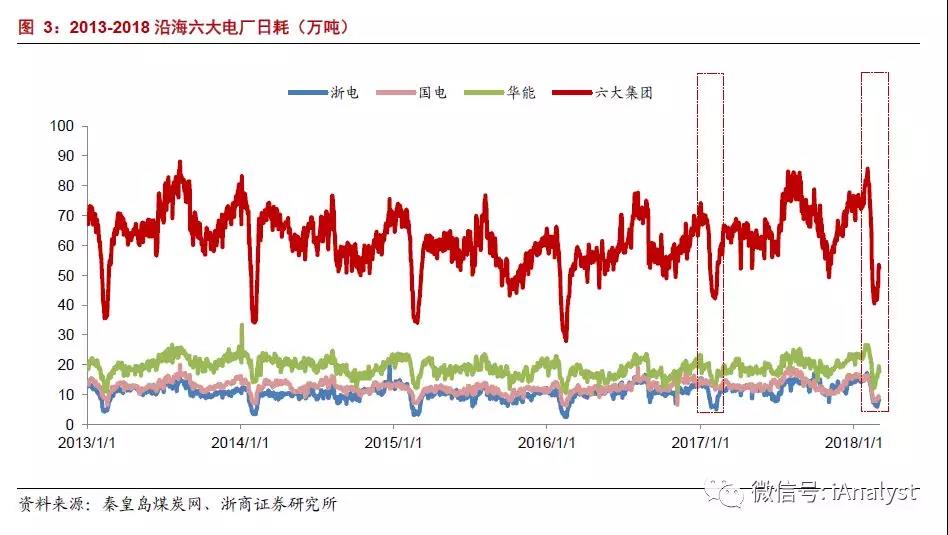 如以春節(jié)期間供給測算,日耗與庫存提升對應(yīng)的供給合計為2213.5萬噸,在不減少電廠庫存的情況下可滿足日耗73.78萬噸的水平,而這一日耗水平高于2014-2016年絕大部分時間的日耗需求,僅小于2017年年中與年末存在極端天氣的情況。