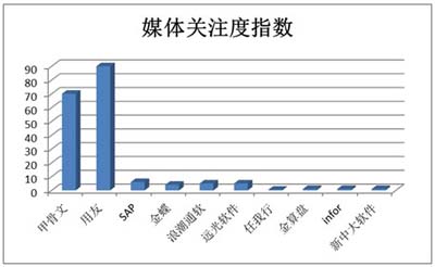 媒體關(guān)注度方面:9月份,“用友用戶大會”和“甲骨文全球大會”相繼召開,用友軟件與甲骨文均獲得超高媒體關(guān)注度,關(guān)注度指數(shù)分別達(dá)到90與70,遠(yuǎn)高于其它ERP品牌;SAP排名第三,關(guān)注度為6。(如下圖所示)。