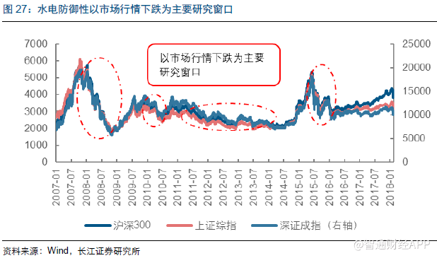 在我國(guó)經(jīng)濟(jì)增速下行的滯漲期和衰退期,水電由于其穩(wěn)定的收益和較高的分紅比例,在股市行情下行的時(shí)間窗口中能夠表現(xiàn)出相對(duì)較好的抗跌性,具備投資防御價(jià)值。此外,水電穩(wěn)定的收益決定了其在經(jīng)濟(jì)滯漲期的投資防御性,而高分紅帶來(lái)的類債券投資價(jià)值則決定了其在衰退期的投資防御性。