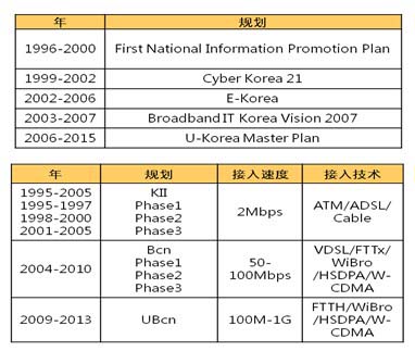 韓國政府是制定國家寬帶規(guī)劃和成功執(zhí)行規(guī)劃的表率。韓國的寬帶規(guī)劃隸屬于國家信息化規(guī),國家信息化規(guī)劃重要的階段包括Cyber Korea 21,e-Korea,U-Korea等,如下圖所示。國家寬帶主要規(guī)劃內(nèi)容如下,在不同階段規(guī)劃了詳細(xì)的接入技術(shù)、接入速度,對后期執(zhí)行起到了比較好的指導(dǎo)作用,韓國國家規(guī)劃時(shí)間周期比較長,分階段規(guī)劃,總周期達(dá)到20年,更難得的是堅(jiān)持落實(shí),完成了規(guī)劃目標(biāo)。